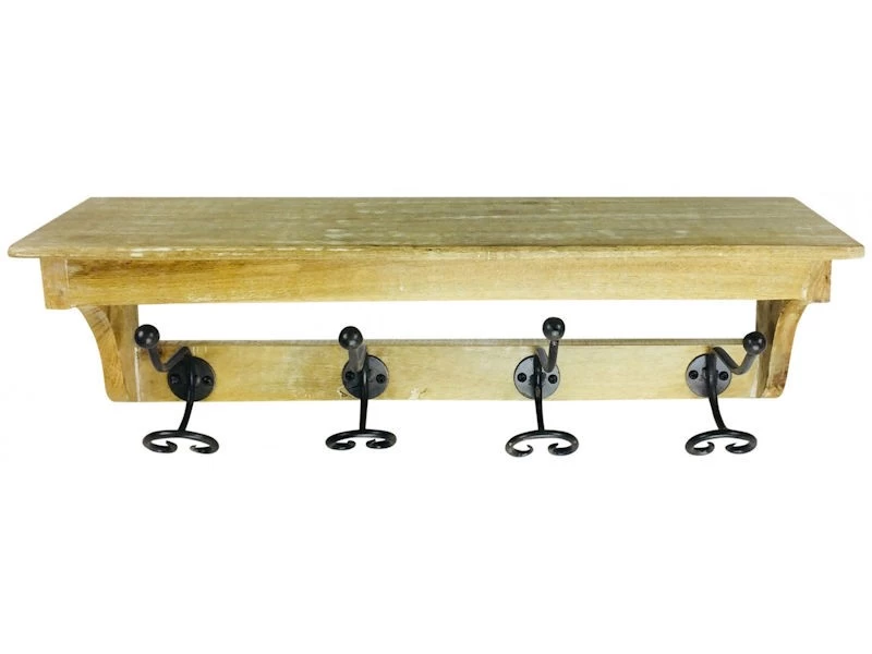 Solid Wood Shelf With 4 Metal Coat Hooks