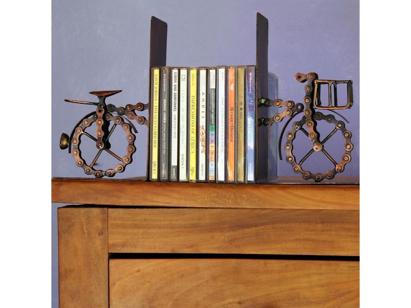 A pair of unique bookends crafted from recycled bike chains, perfect for cyclists and lovers of sustainable design.