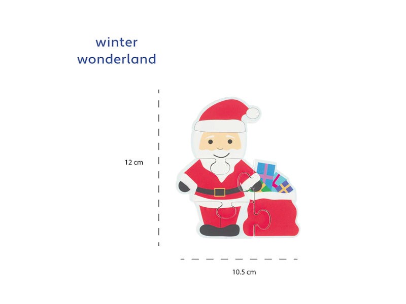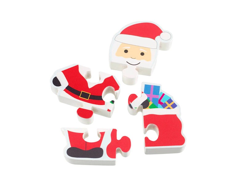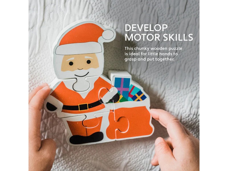 A festive wooden puzzle featuring a cheerful Father Christmas with his sack of presents, perfect for little hands to enjoy.
