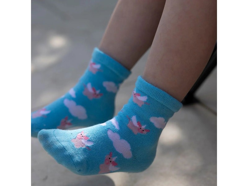 These delightful bamboo socks bring a gentle sense of whimsy to little feet with their sky blue background and charming pink flying pigs drifting between soft white clouds. The lightweight bamboo knit feels wonderfully smooth and comforting, giving children a pair they will love to slip into each day.