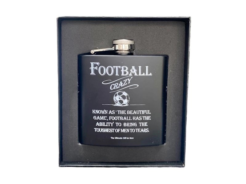 Crafted in a matte black finish, this football themed hip flask is made for the true believer the one who knows the agony of a last minute miss and the joy of a stoppage time winner. With bold white typography and a classic football motif, the front reads:
