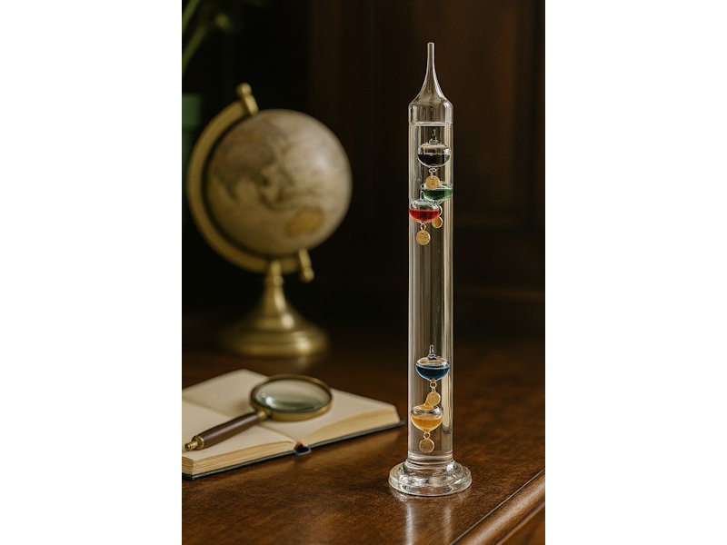 Based on Galileo’s early experiments with liquid density and temperature, this 24cm glass thermometer features five colourful floating bulbs, each tagged with a brass temperature marker. As room temperature changes, the bulbs gently rise or fall, offering a mesmerising and accurate visual reading.