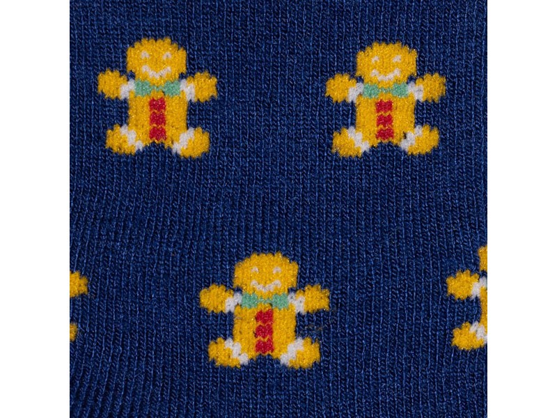 Festive navy bamboo socks decorated with cheerful gingerbread men and finished with bright orange accents.