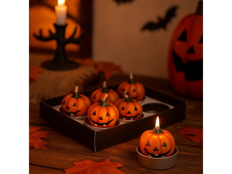A set of six pumpkin-shaped tealight candles to bring a warm and spooky glow to your Halloween celebrations.