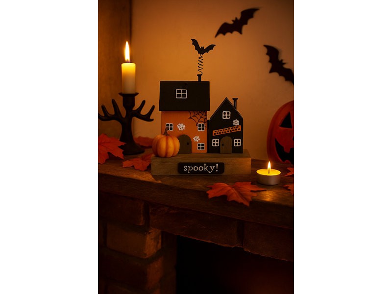 A charmingly eerie wooden house ornament to bring a touch of Halloween spirit into your home.