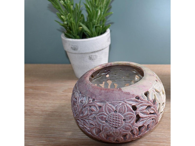 A round soapstone tealight holder, hand carved with floral patterns to cast a warm, delicate glow.