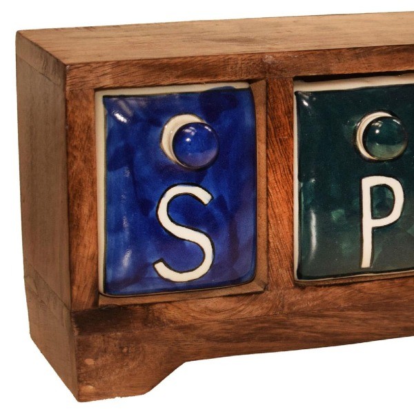 Crafted from richly grained mango wood and fitted with five brightly coloured ceramic drawers, this unique chest brings both function and fun to the kitchen. Each drawer is hand painted with a letter, together spelling out the word ‘SPICY’ in vibrant tones of blue, green, red, orange and yellow making it as decorative as it is practical.