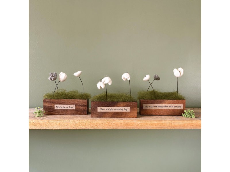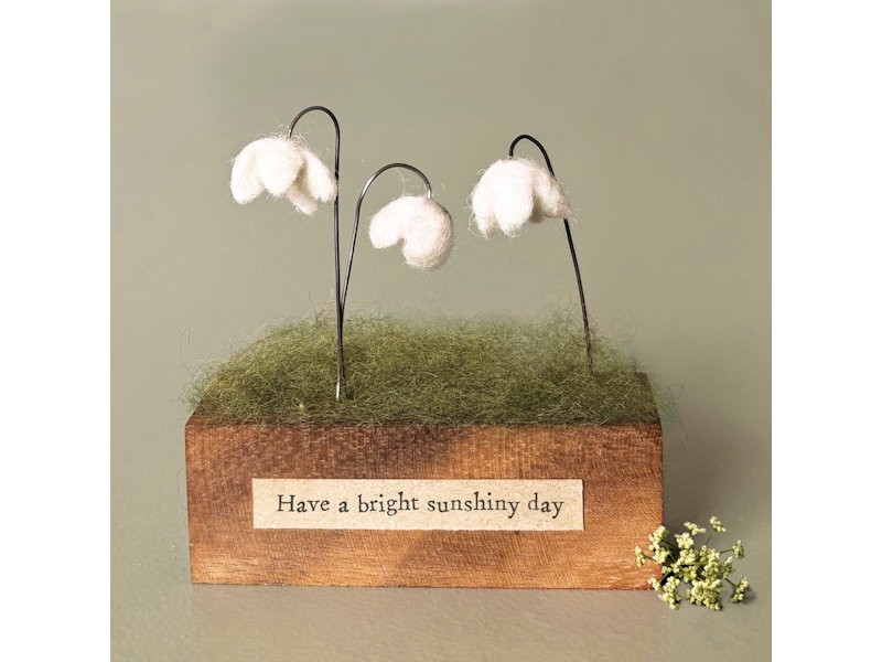 This cheerful little felt flower block is the perfect pick me up for someone who brings the sunshine with them. Topped with three delicate, downward-facing white felt blooms, it’s rooted in soft green felt “grass” and set in a warm mango wood base.