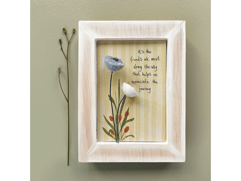 This beautiful framed print features a hand felted duo of flowers, one grey, one white and rising delicately above a painted stem with soft botanical detail. The background is softly striped in pale yellow, with the hand lettered message: “It’s the friends we meet along the way that helps us appreciate the journey.” Set within a whitewashed wooden frame, it’s a comforting piece that brings warmth and meaning to any room.
