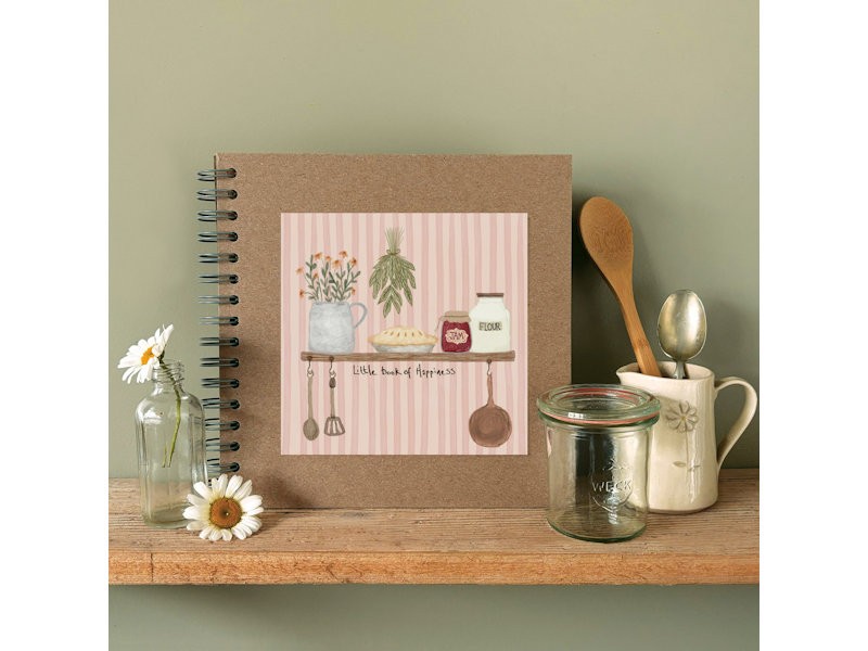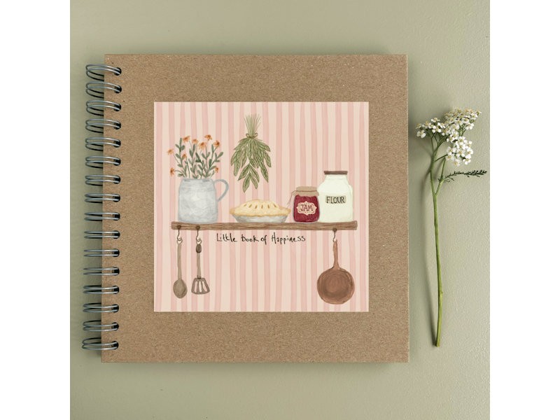 This spiral bound kraft notebook is a delightful spot for jotting down feel good thoughts, treasured recipes or everyday reflections. The illustrated cover features a soft pink stripe backdrop with rustic baking essentials, a jar of jam, a pie, herbs, and wooden spoons, with the words “Little book of Happiness” gently inscribed below. Inside, 60 plain pages await your notes, scribbles, or sketches, all held together with sturdy wire binding.