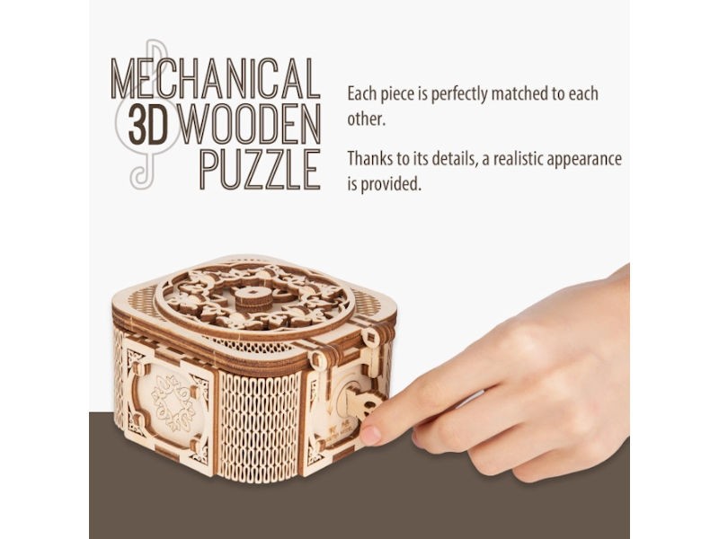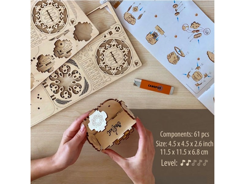 A beautifully intricate wooden music box puzzle that combines craftsmanship, curiosity and creativity in one delightful build.