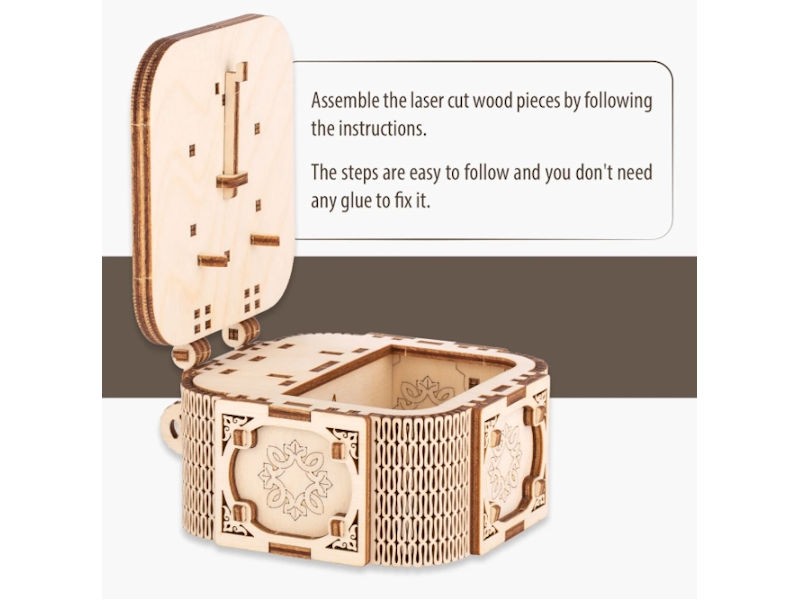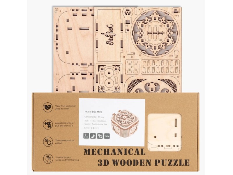 - Made from ecological wood materials 61 precision laser cut pieces No glue or tools required for assembly Plays “Castle in the Sky” melody Educational hands on STEM project Recommended for ages 14 and over