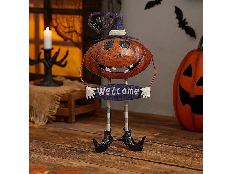 A charming metal pumpkin figure in a witch’s hat, grinning wide and holding a friendly “Welcome” sign to greet your ghouls and guests.