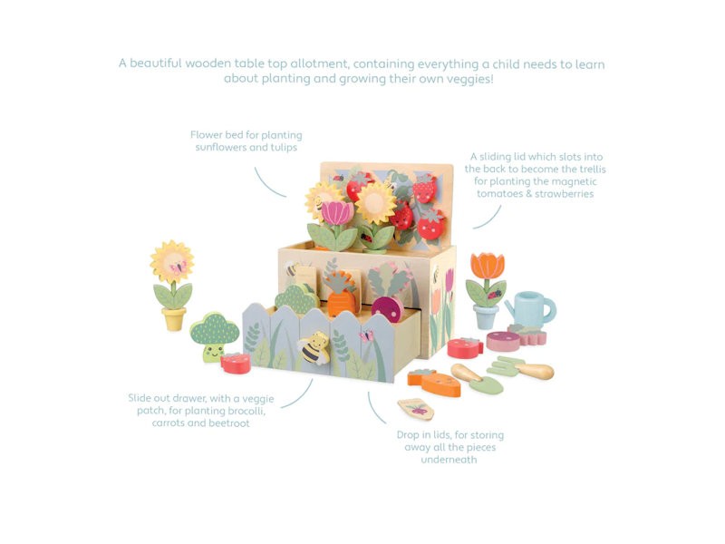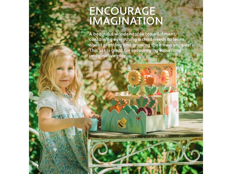 - Wooden tabletop allotment play set Includes flowers, vegetables, and gardening tools