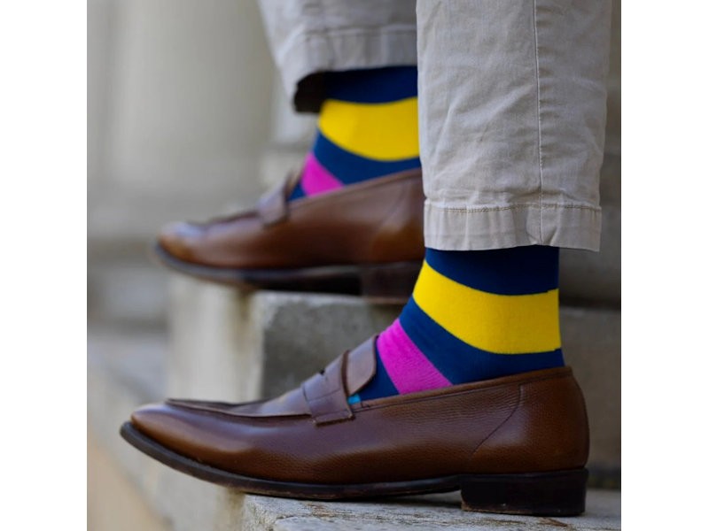 These neon striped bamboo socks stand out with vibrant bands of blue, pink, yellow and navy creating a fun confident look. The soft bamboo blend feels smooth against the skin and helps keep feet fresh throughout the day thanks to its natural breathability.