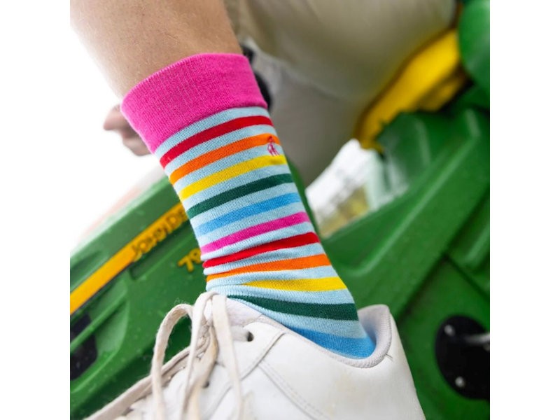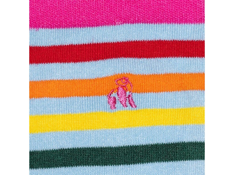 These pastel striped bamboo socks blend sky blue, pink, yellow, green and orange into a lively pattern that feels fresh and uplifting. Finished with bright pink cuffs heels and toes they add a playful touch to trainers and casual shoes.