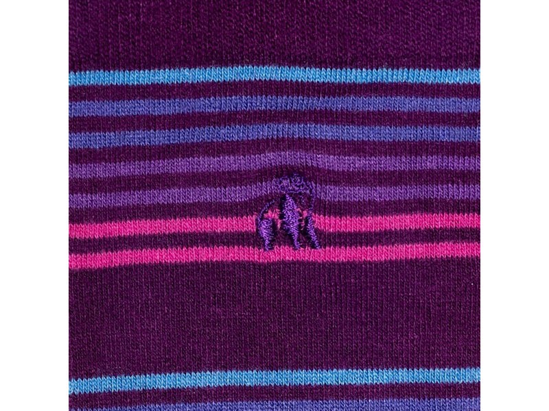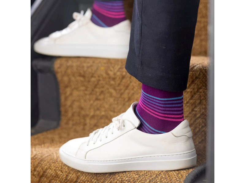 Deep purple bamboo socks with fine pink and blue stripes for a smart splash of colour.