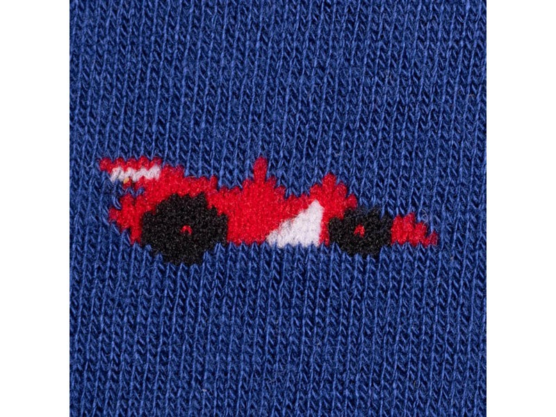 Bold blue bamboo socks decorated with speedy red racing cars and bright red accents.