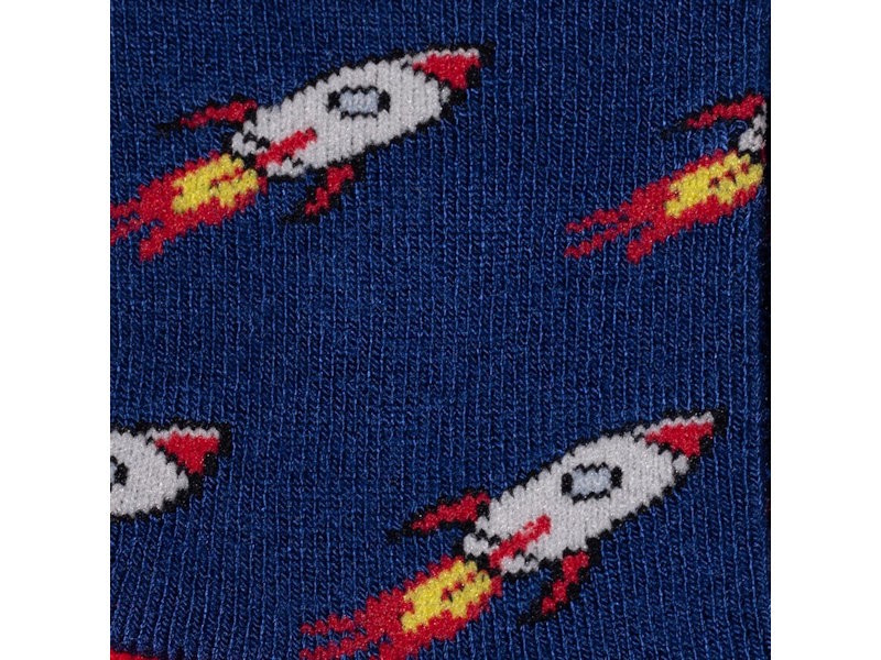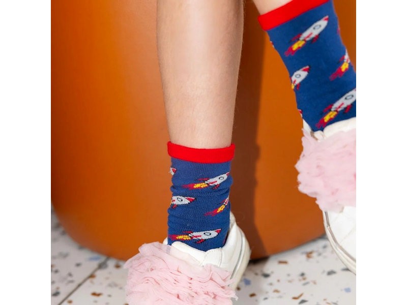 Deep blue bamboo socks featuring colourful soaring rockets with bold red accents.