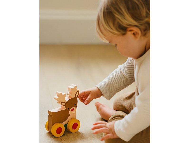 A charming wooden push toy featuring Rudolph the Red Nosed Reindeer, ready to roll into festive playtime fun.