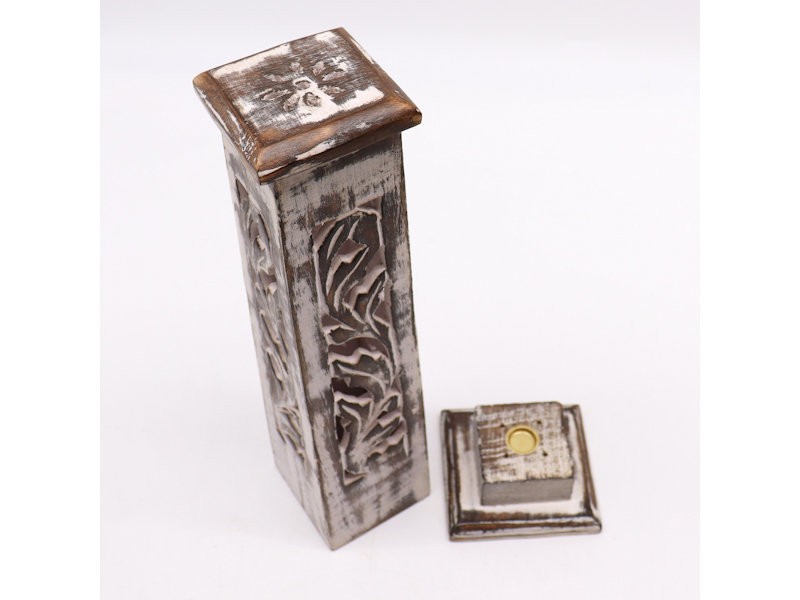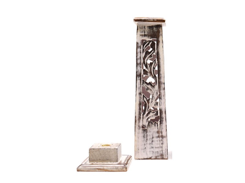 - Hand carved wooden incense tower with leafy cut out design