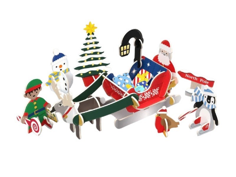- Includes Santa, sleigh, reindeer, elf, snowman, penguin, robin and backdrop