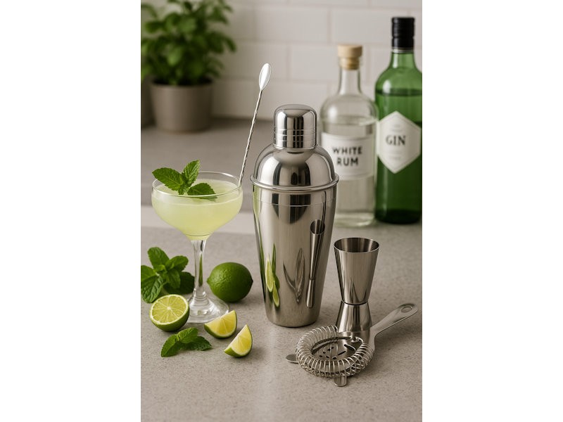 Shake up your evenings in style with this polished stainless steel cocktail shaker set. A sleek and essential kit for home mixologists and cocktail connoisseurs.