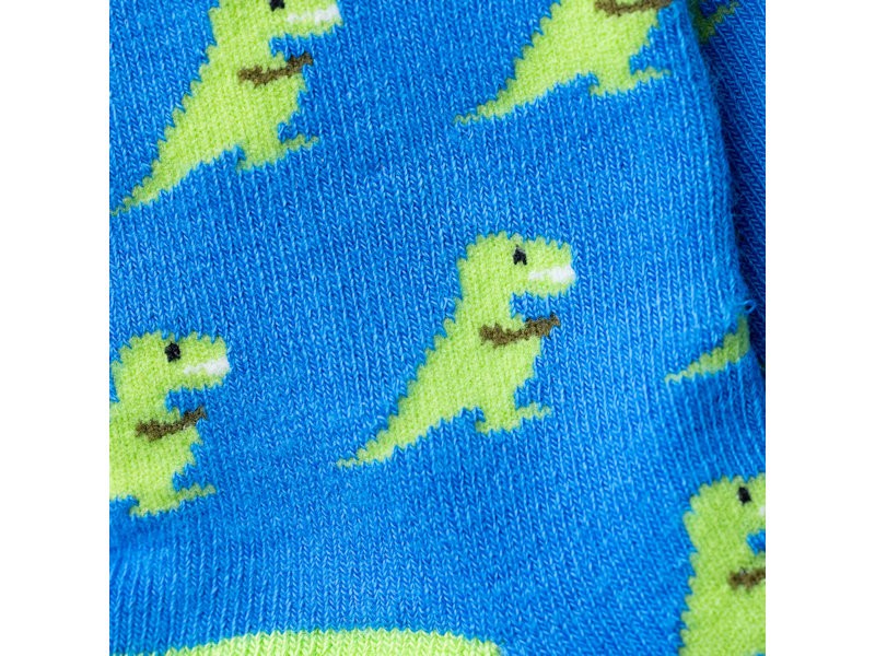 Bright blue bamboo socks covered with cheerful green T-Rex characters and finished with soft lime accents.