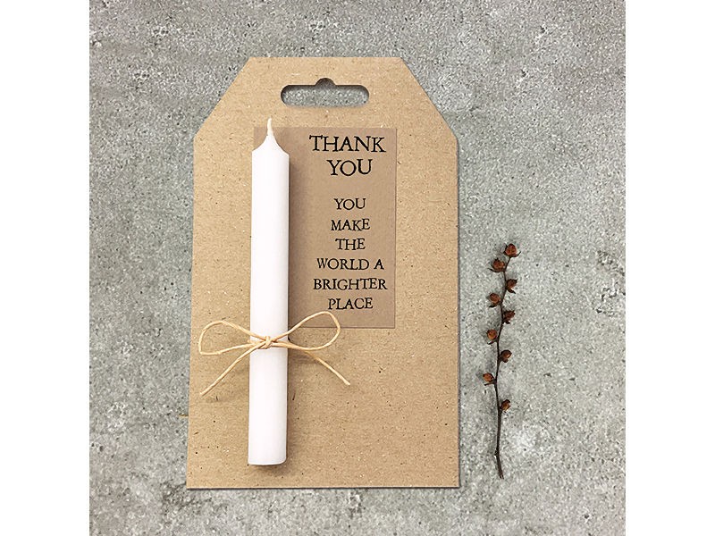 This sweet candle card combines a warm message with a beautifully simple gift. A single white candle is hand tied with raffia to a kraft backing card, which reads: “Thank you – You make the world a brighter place.” It’s ready to gift just as it is. Perfect for slipping into someone’s hand, popping through a letterbox, or placing alongside a bunch of flowers.