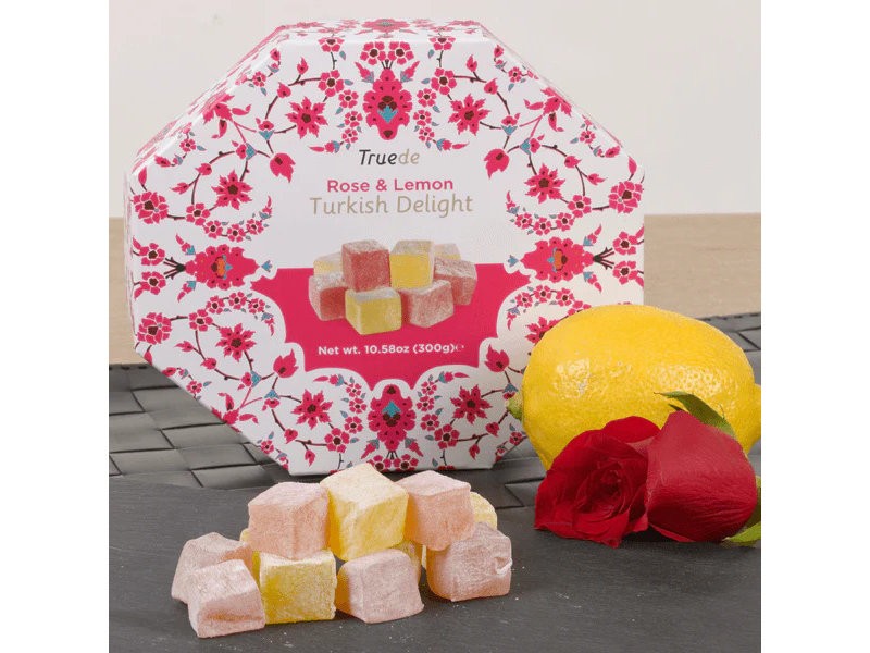 Truede Rose and Lemon Turkish Delight brings together two classic flavours in a beautifully packaged gift box. The rose pieces are gently perfumed with floral sweetness, while the lemon offers a bright, citrus lift, each one soft and perfectly dusted with icing sugar.