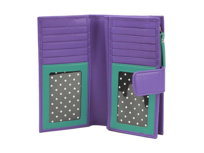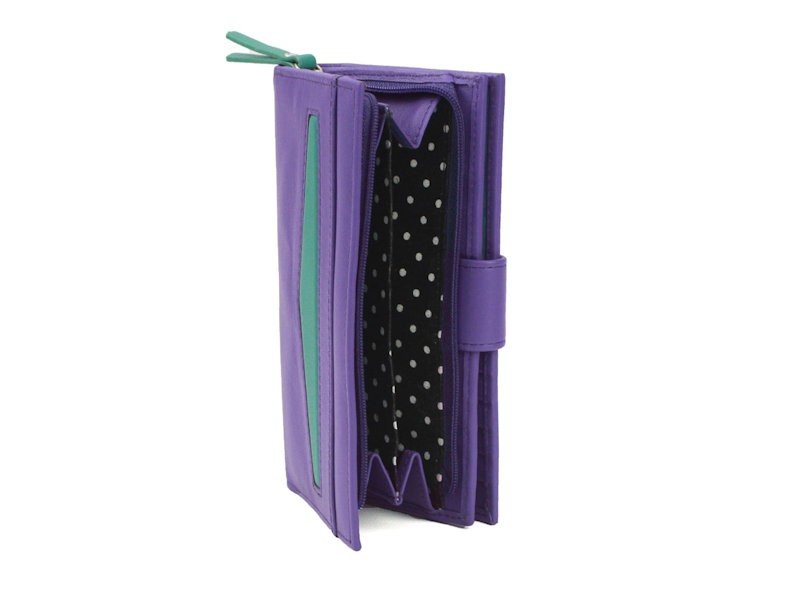 A stylish two tone leather purse in violet and turquoise, designed with smart organisation and a pop of playful colour.