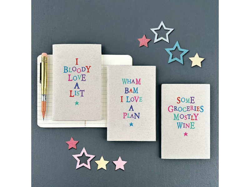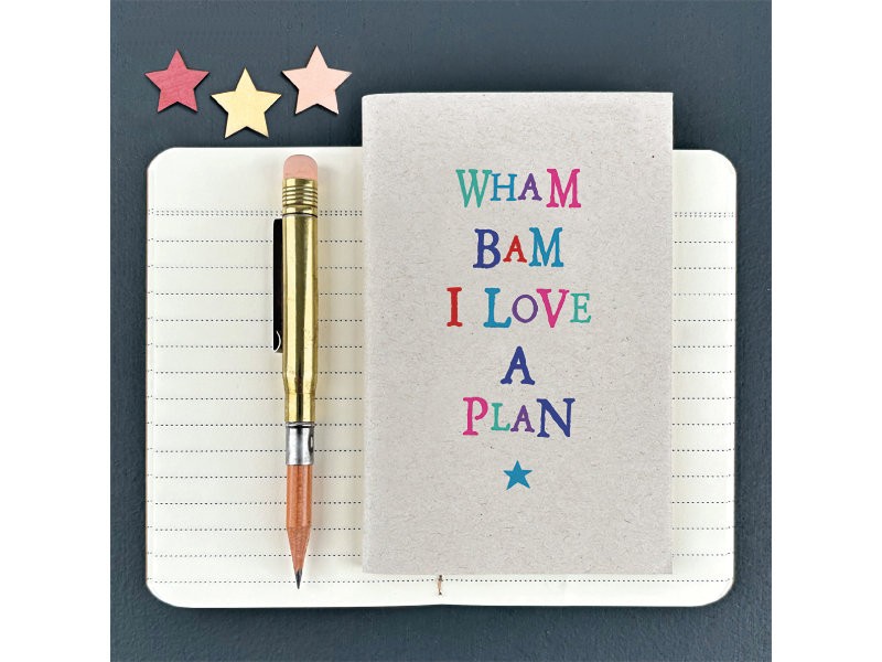 This playful A6 notebook is made for those who love a bit of structure with their sparkle. Featuring the bold slogan “Wham Bam I Love A Plan” in cheerful rainbow letters, it’s crafted from recycled card with lined pages inside for all your notes, ideas and masterplans.