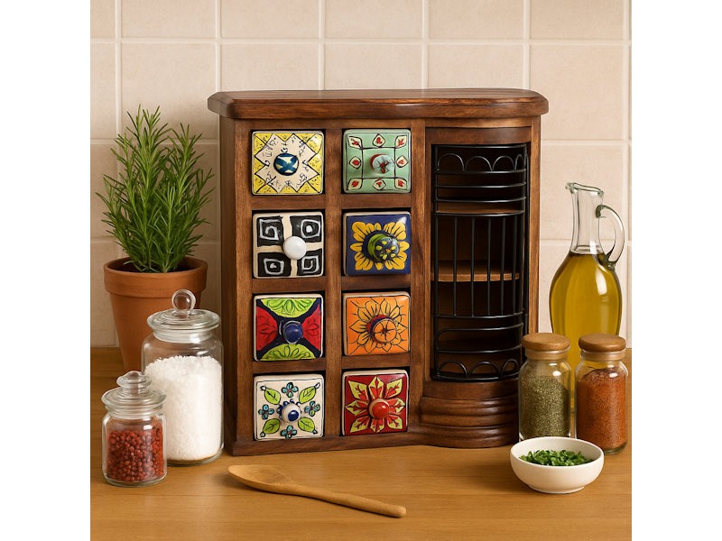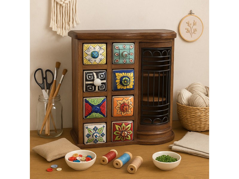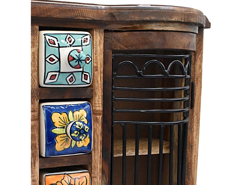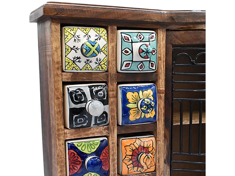 This delightful chest combines rustic wooden craftsmanship with a splash of artistry. Each ceramic drawer is hand painted in a unique pattern, bringing together bold colours and intricate designs that feel both playful and timeless. The result is a piece that draws the eye and lifts the mood of any room.