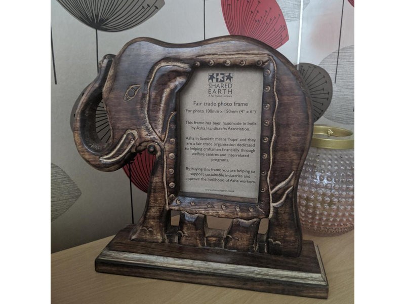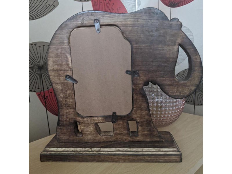 A hand carved wooden photo frame shaped in the charm of an elephant, crafted with care and character.